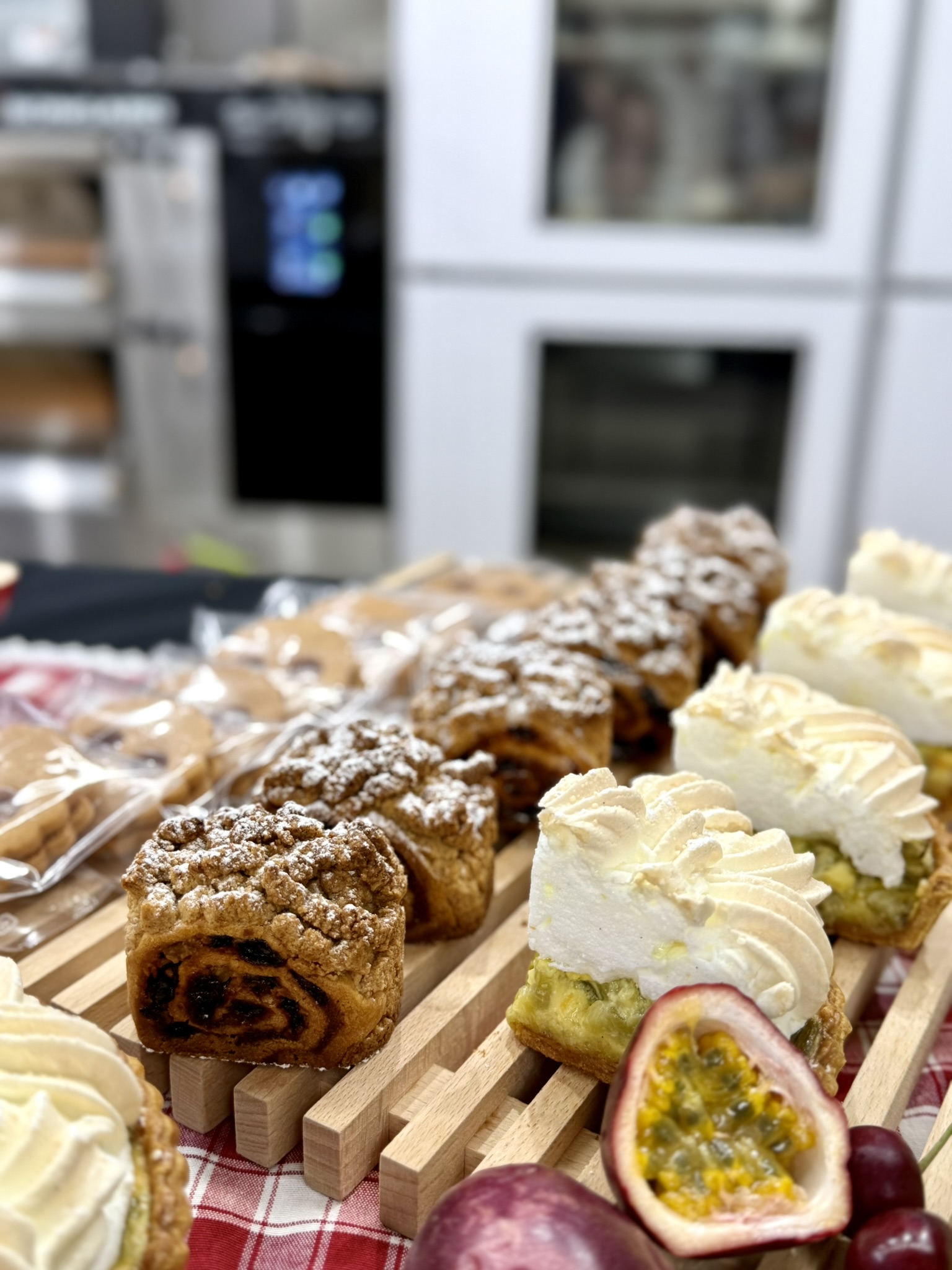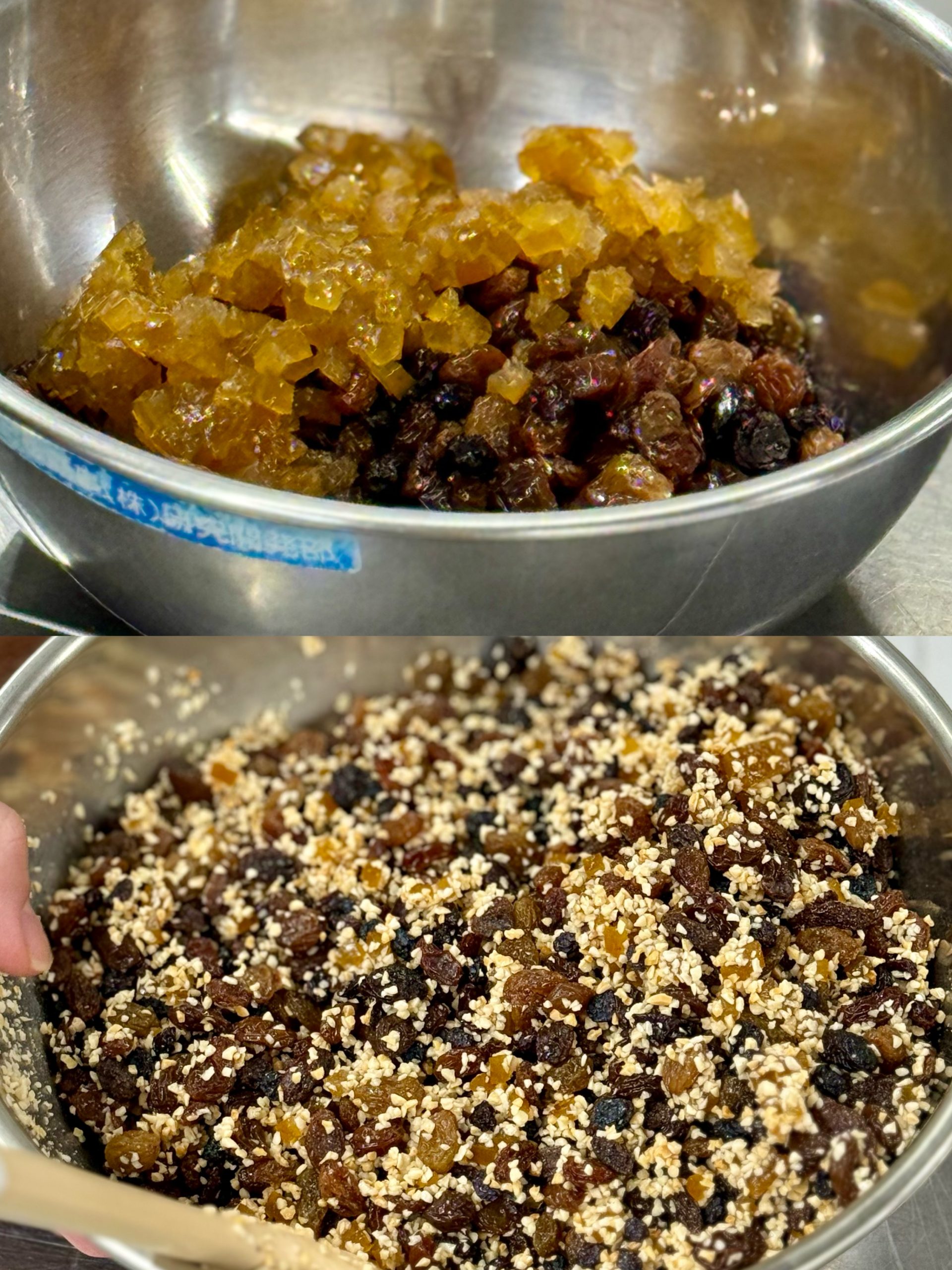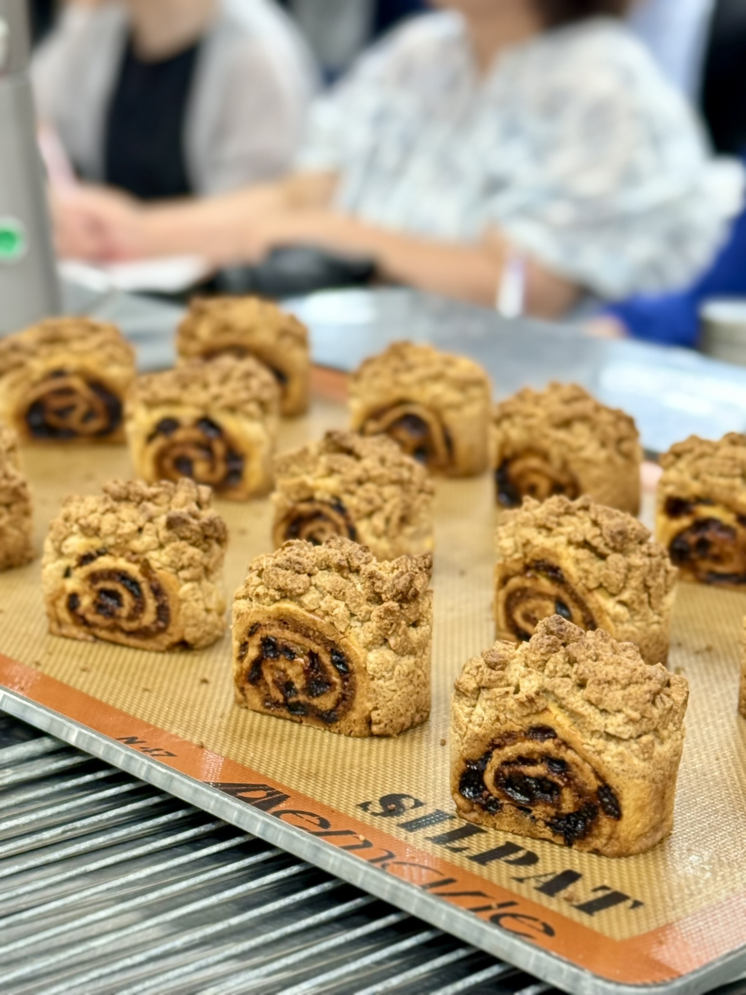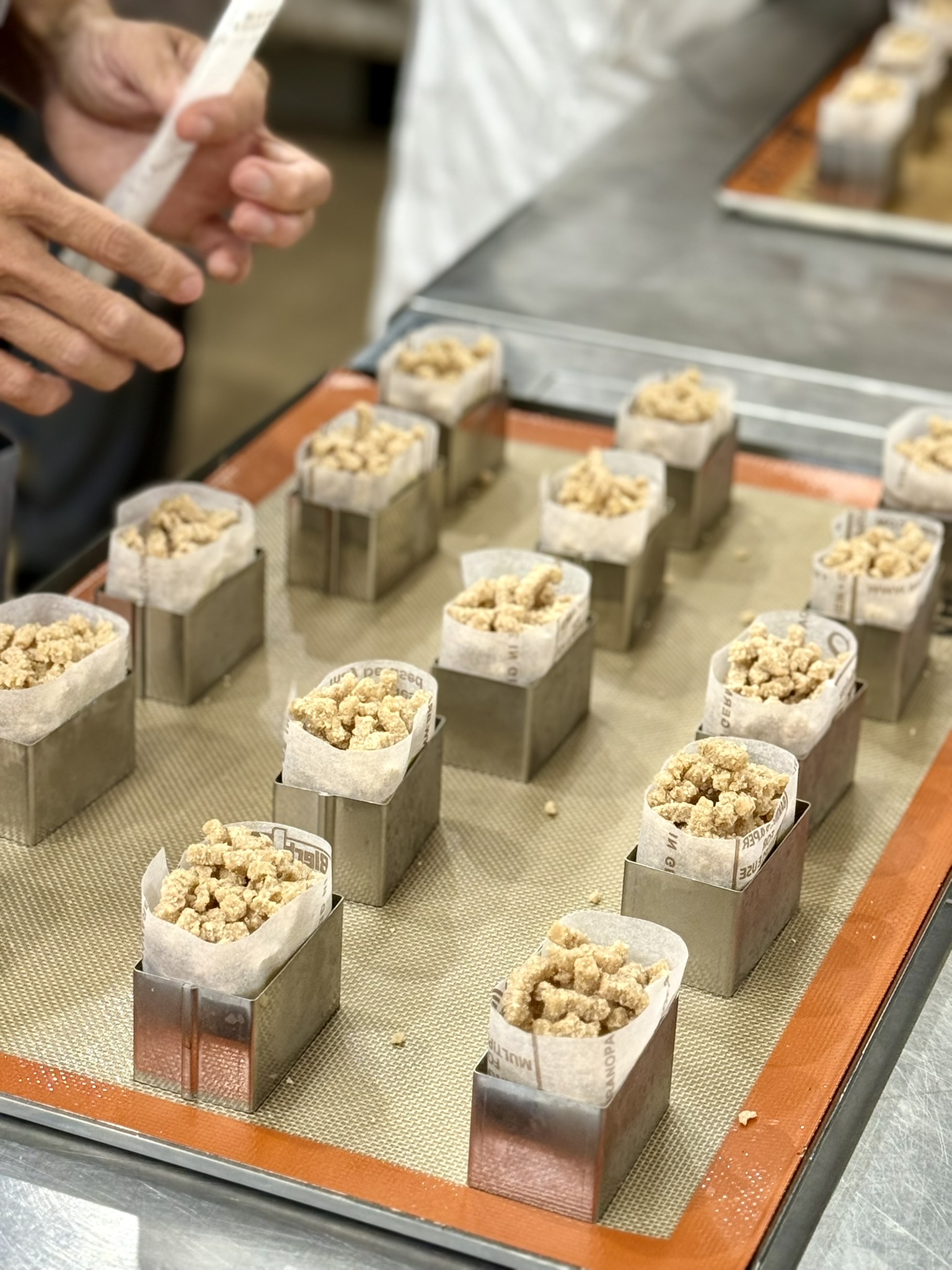 シュトロイゼルをのせ、焼成後は粉糖をふって完成です。