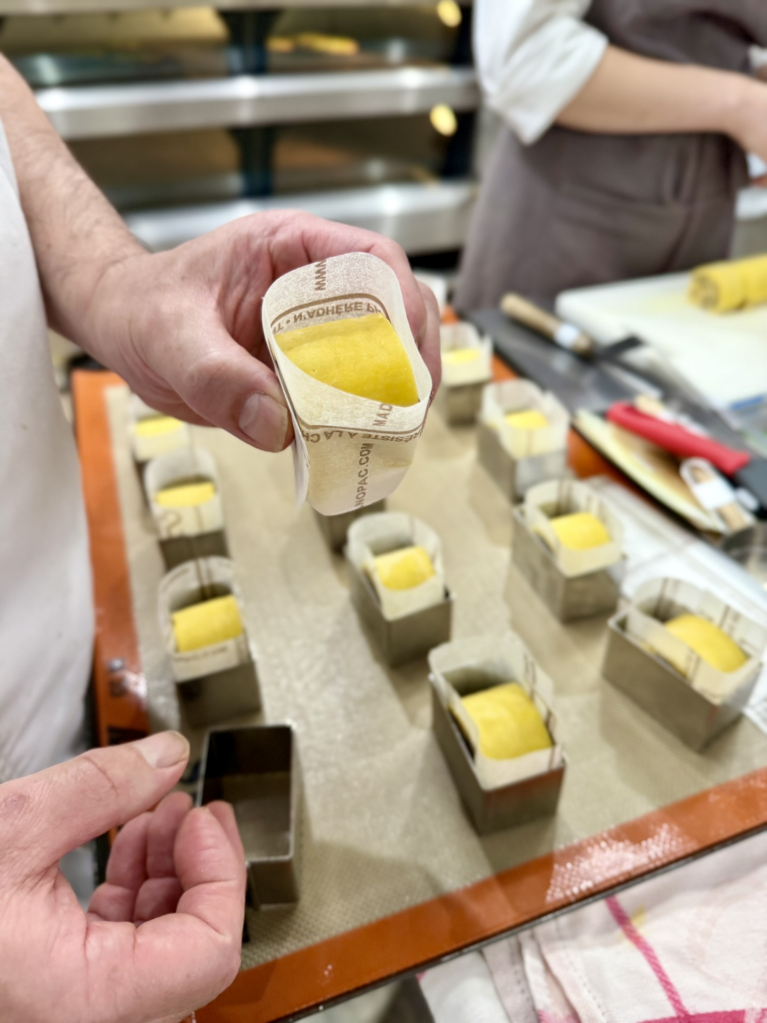 生地をカットし、ベーキングシートで巻いてセルクルへ。