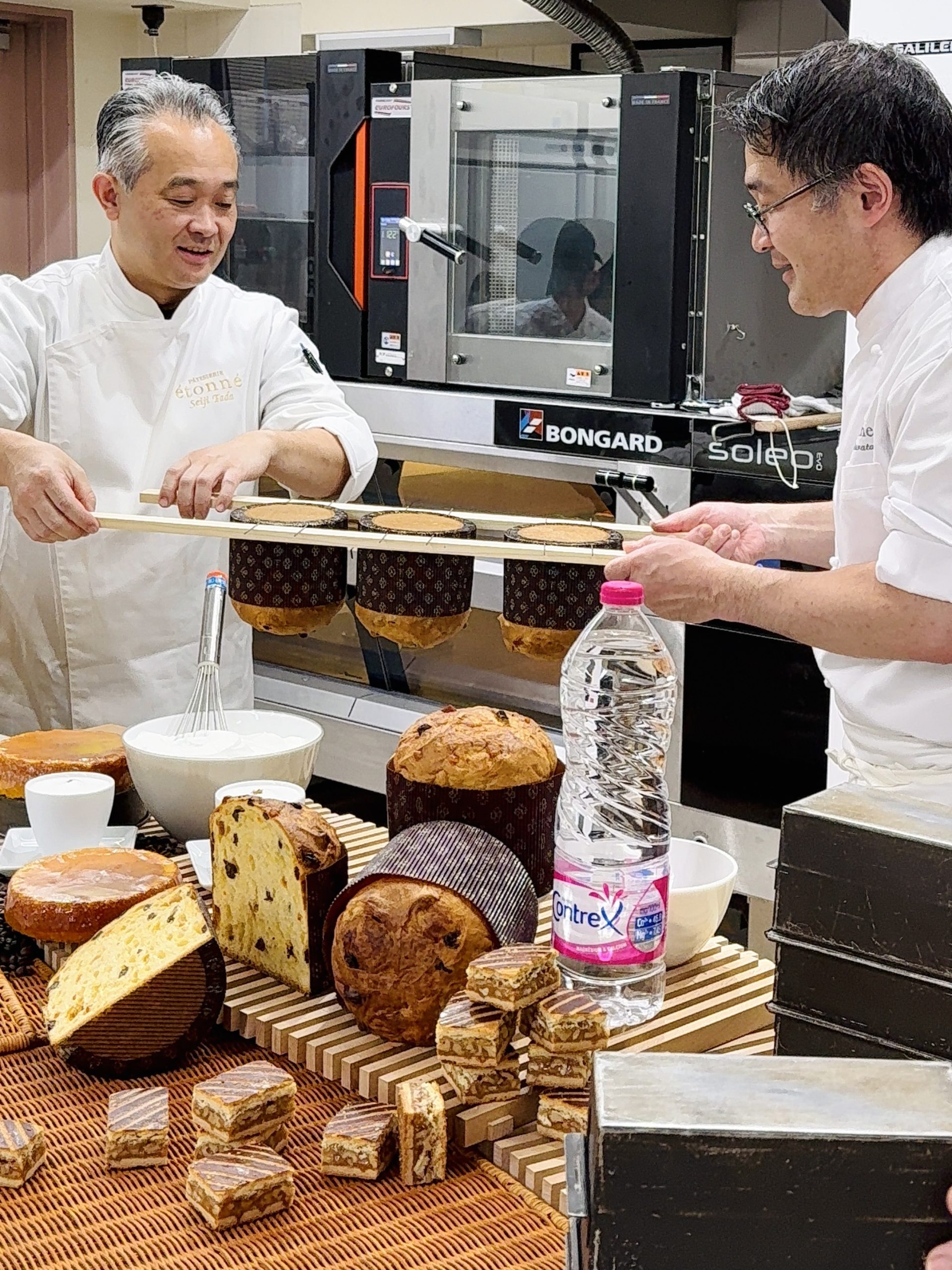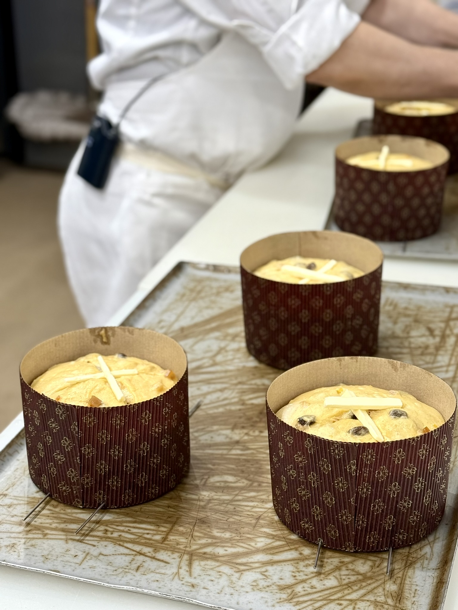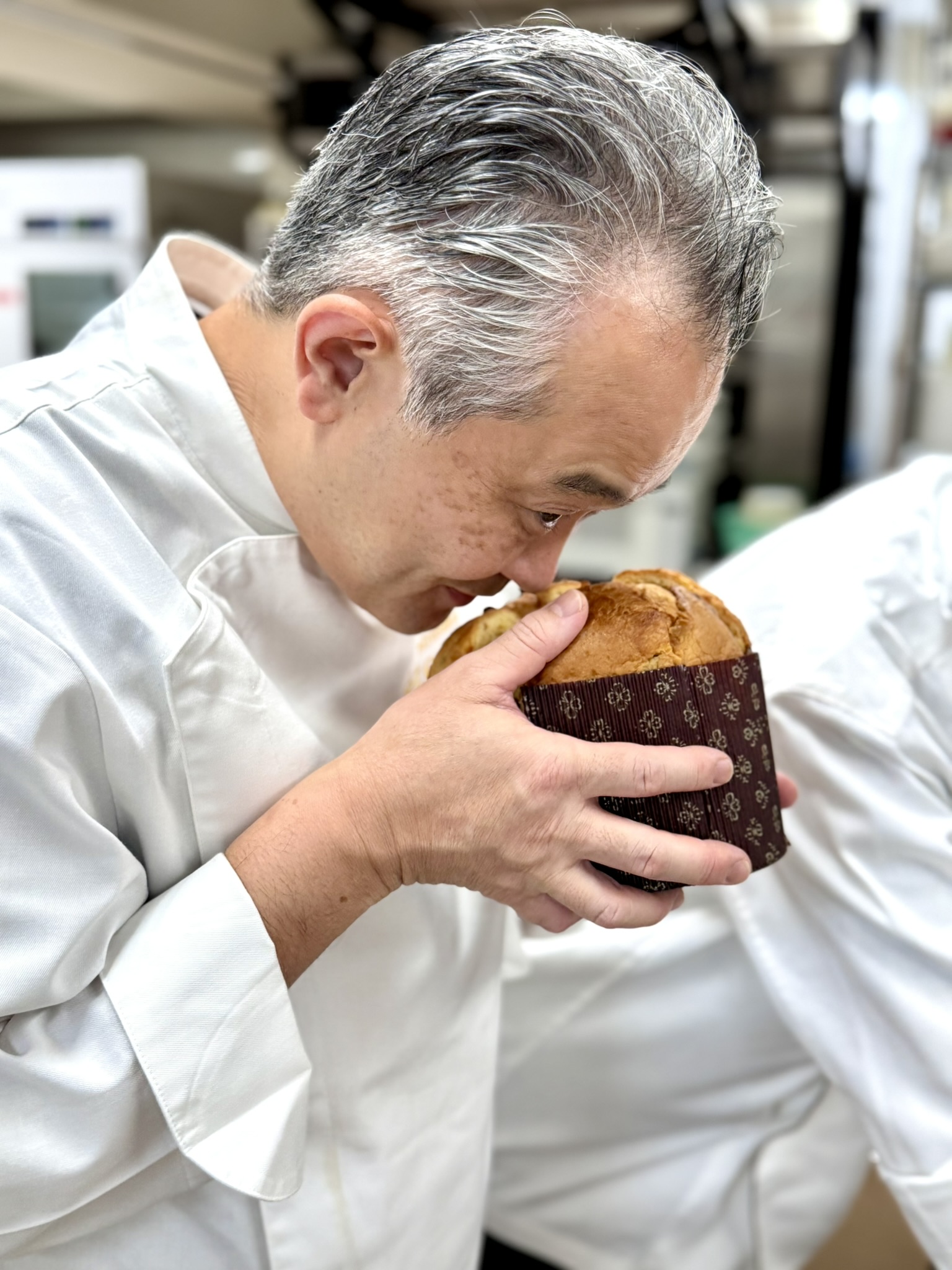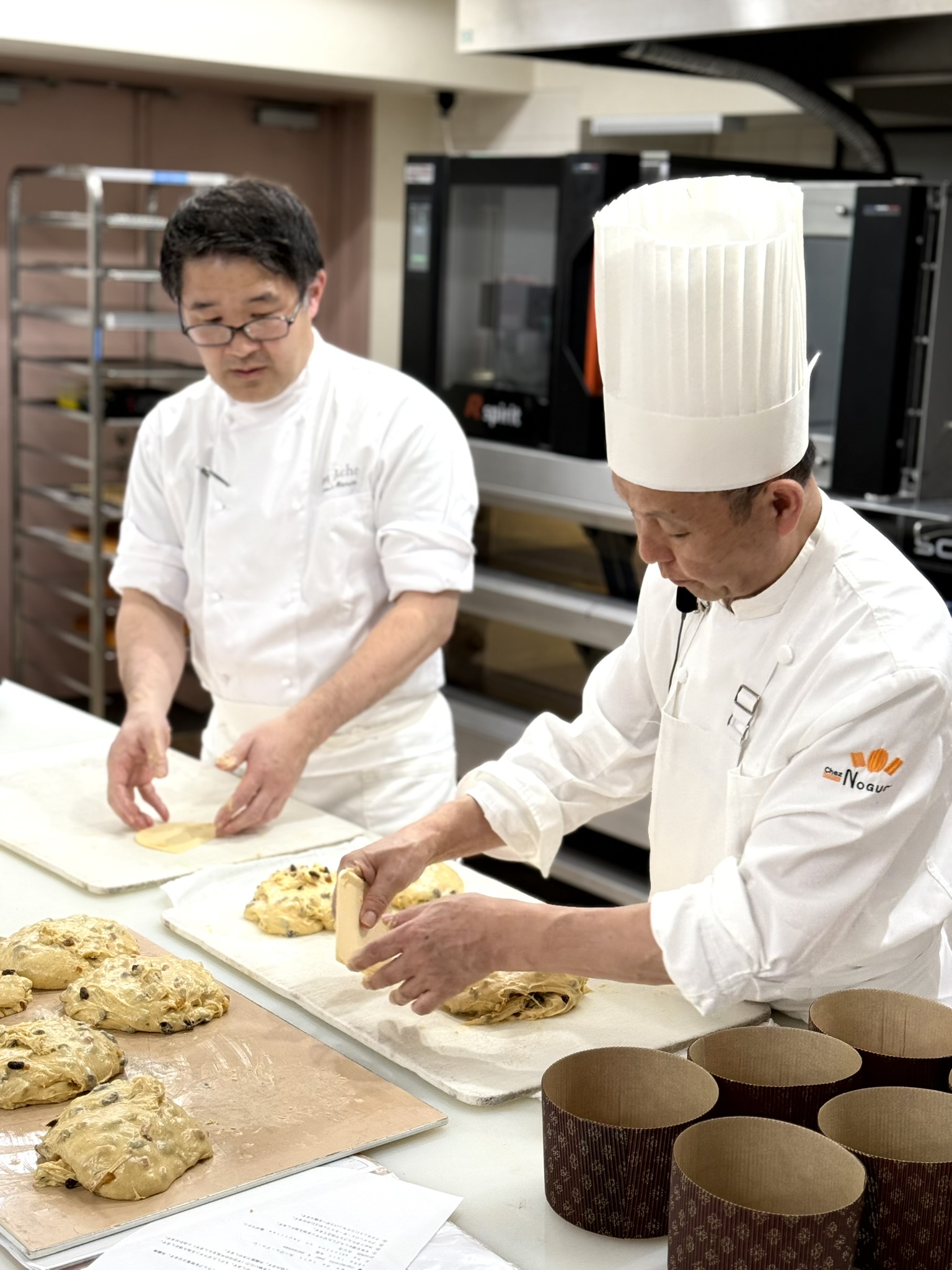 焼成前からパネトーネカップに串を刺すのも野口流で