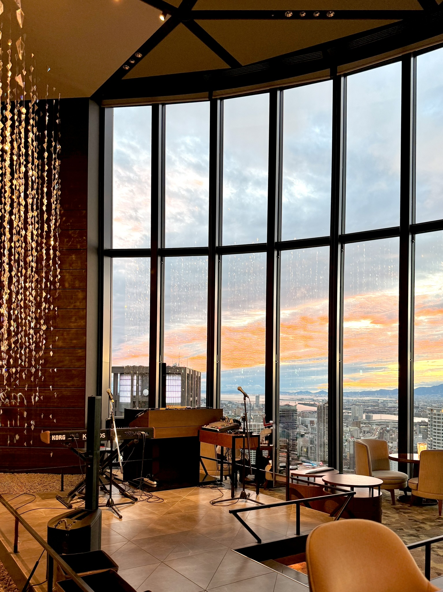 ラウンジの窓一面に広がる大阪のパノラマビューが