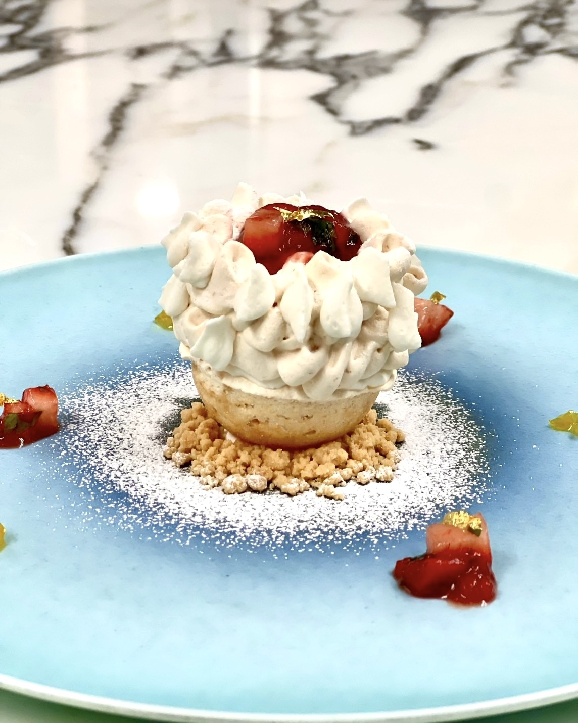 いちごパウダーと奄美大島産きびら糖のジュレを添えて